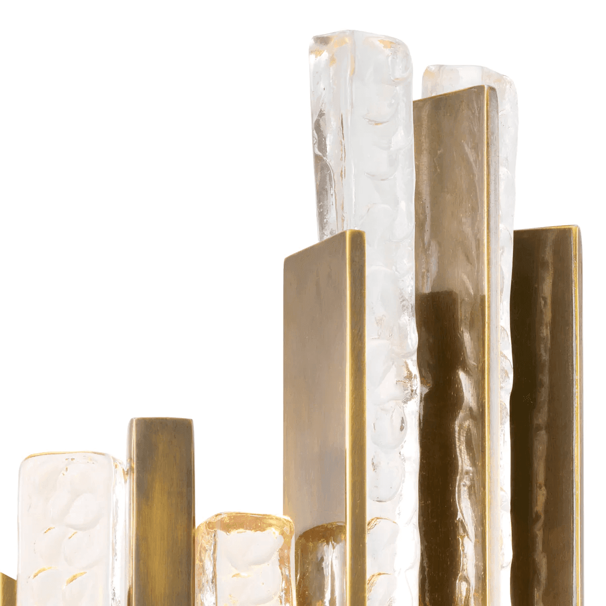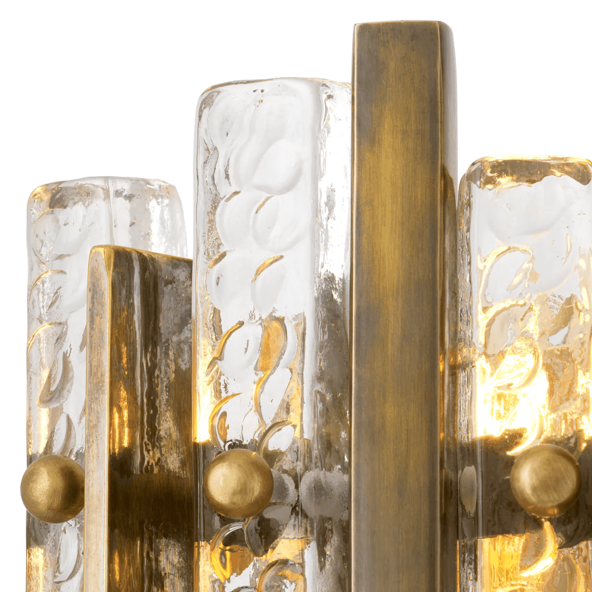Cu panouri din sticlă realizate manual, decorate cu un model decupat și bare cu finisaj din alamă vintage, această aplică emană rafinament și lux modern. Sticla texturată adaugă profunzime subtilă și un caracter artizanal, în timp ce barele din alamă îi accentuează farmecul atemporal.