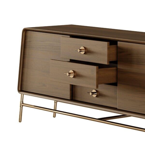 Materiale și finisaje: Lemn de nuc mat și alamă placată cu aur.