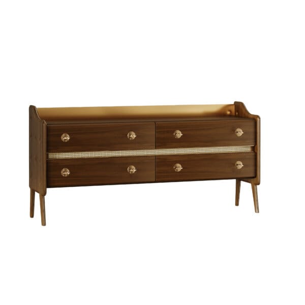 Bufetul Lester este o piesă ce îmbină armonios influențele retro cu o viziune modernă. Cele patru sertare prezintă un design simplu, evidențiat de mânerele strălucitoare, în timp ce structura principală readuce stilul mid-century prin liniile sale atrăgătoare.