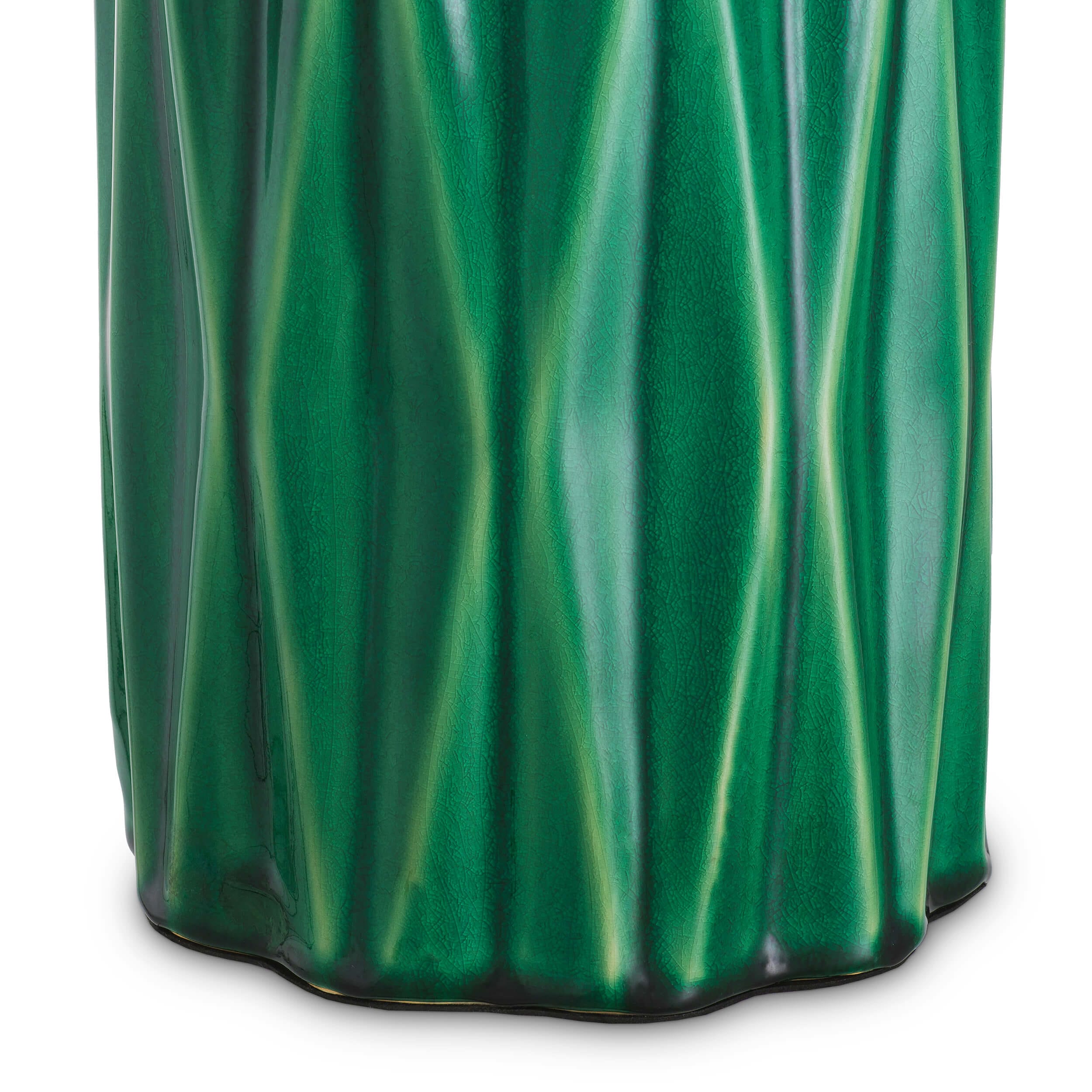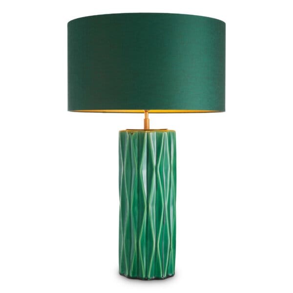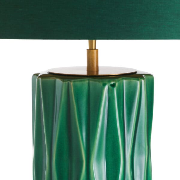 Cu o bază ceramică verde, decorată cu un efect delicat craquelé și accentuată de detalii din alamă antichizată, această piesă impresionează prin prezența sa sculpturală. Abajurul cu aspect de in, finisat la interior cu o căptușeală aurie, completează armonios compoziția.