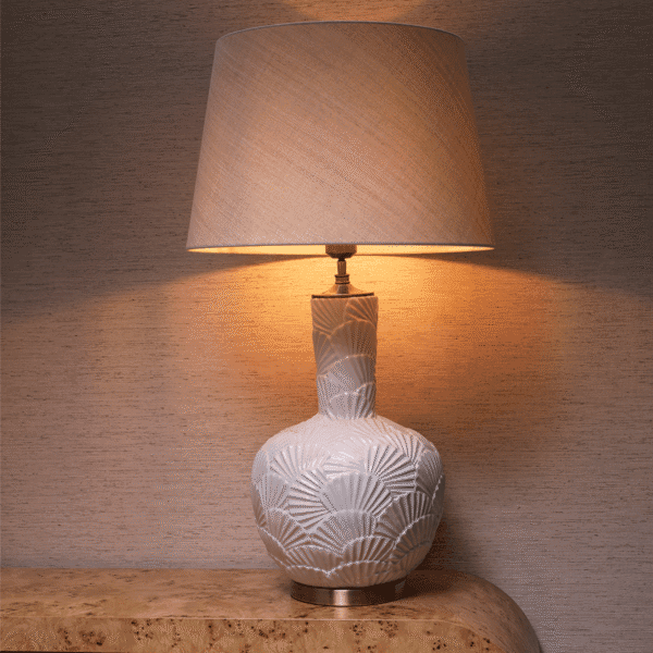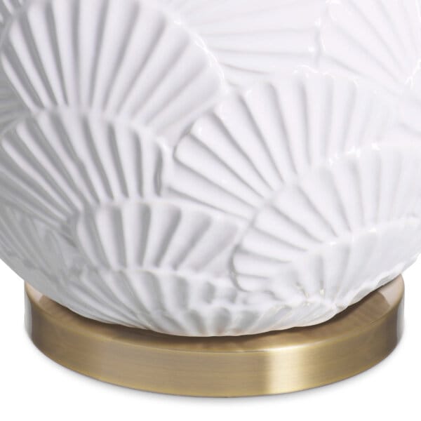 Această lampă marca Eichholtz este realizată din ceramică de culoare albă și include un abajur cu aspect de in, fabricat din fire reciclate. Baza elegantă prezintă un model inspirat de scoici și are un finisaj vintage din alamă antichizată. Perfectă pentru spații de locuit rafinate. Lampa adaugă o notă unică de artă și stil desăvârșit, fiind un adevărat simbol al luxului și sofisticării.