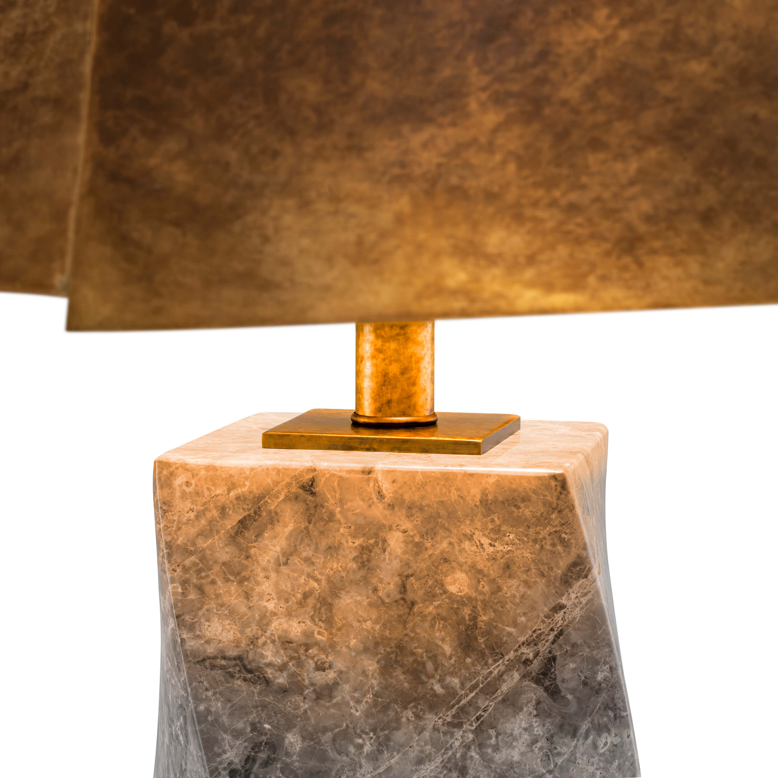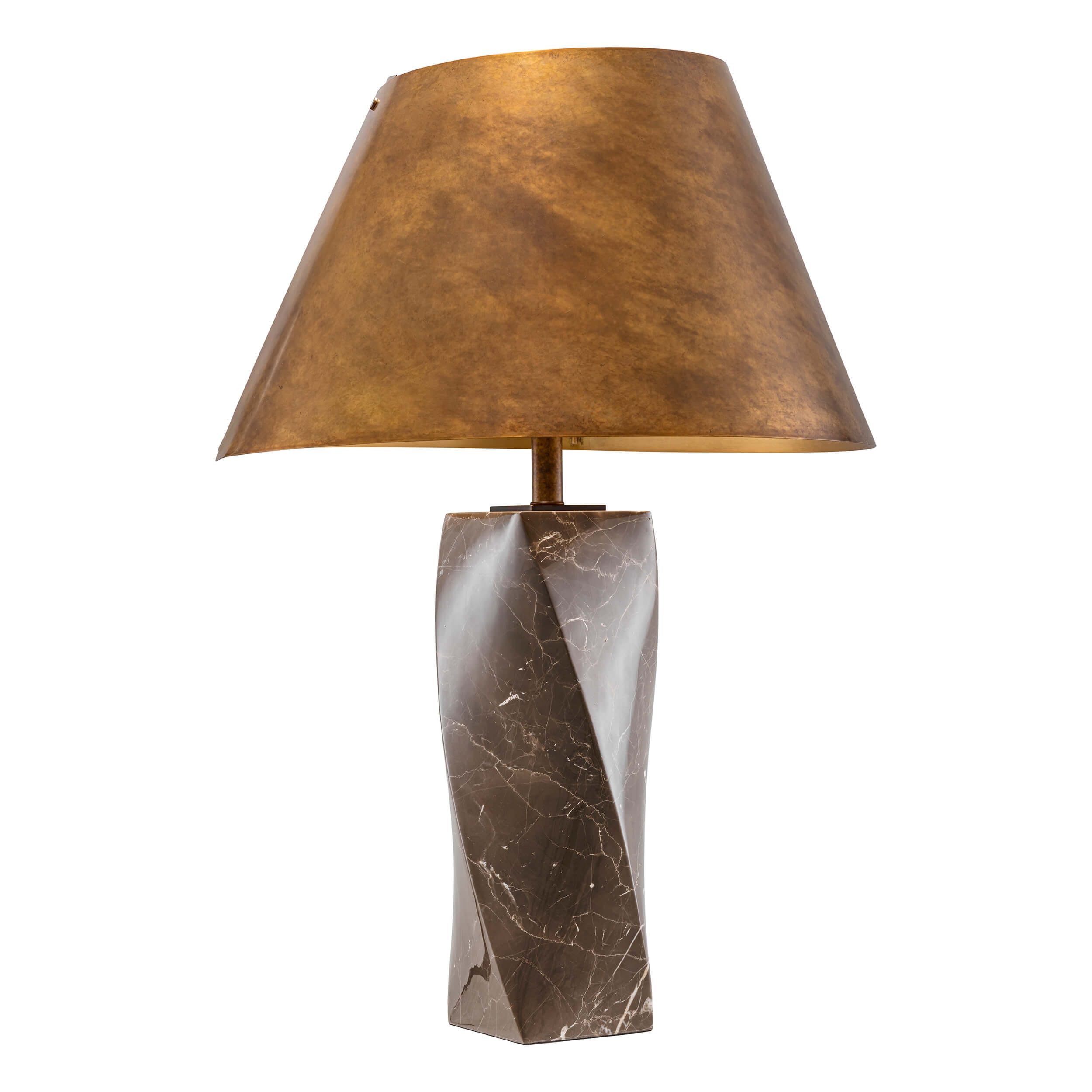 Descoperă lampa de birou Camelia, disponibilă cu bază solidă din marmură gri sau marmură coffee și abajur metalic elegant, finisat în alamă vintage.