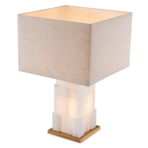 Baza luminoasă din alabastru natural, cu opțiune de iluminare internă, emană căldură, fiind completată de un abajur textil din amestec de in, ales pentru textura sa subtilă și lumina difuză pe care o oferă.